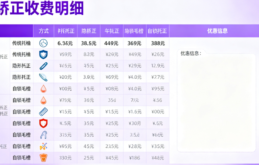 1. 矫正方案:传统金属自锁托槽矫正13000元起采用当下自锁技术,复诊间隔长,矫正效率高;正雅隐形矫正15000元起是国产隐形矫正代表,性价比突出;达芬奇隐形矫正22800元起则在稳准控制上更胜一筹;隐适美隐形矫正29800元起作为国内外品牌,适合对舒适度和美观要求高的患者。